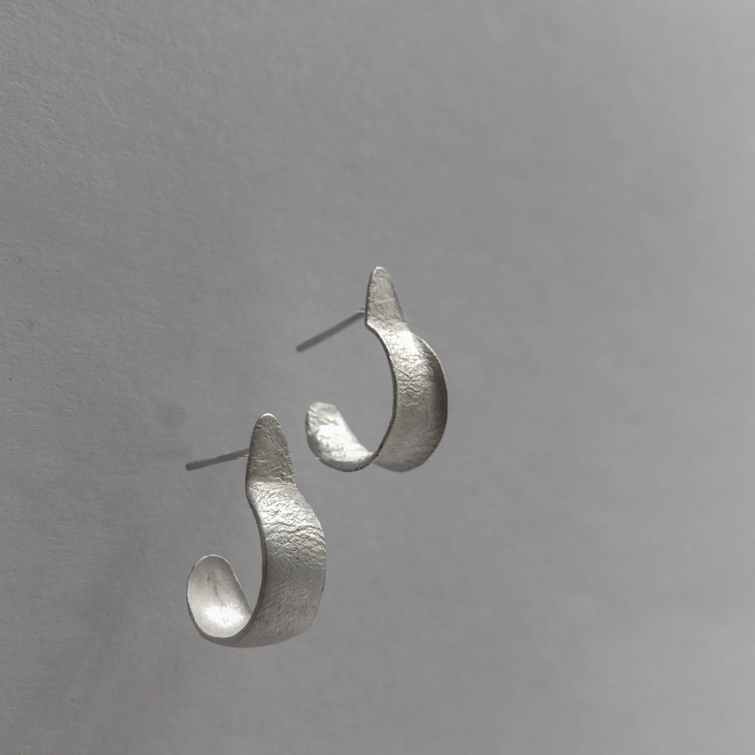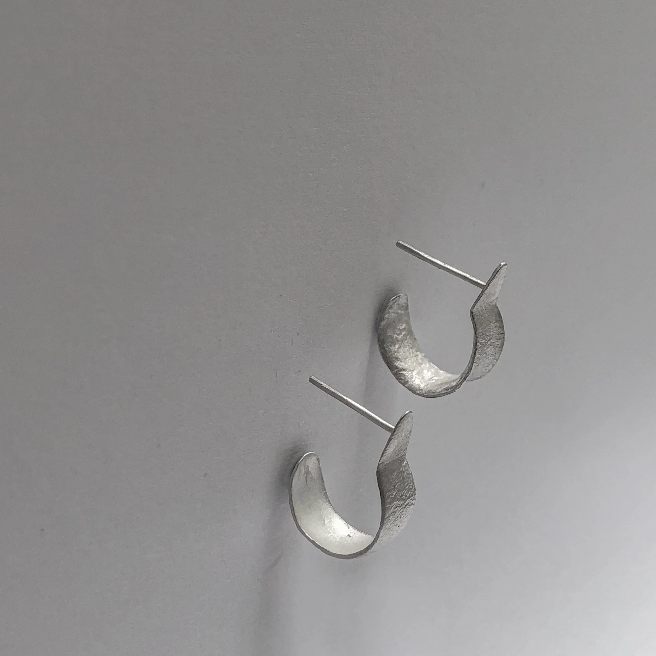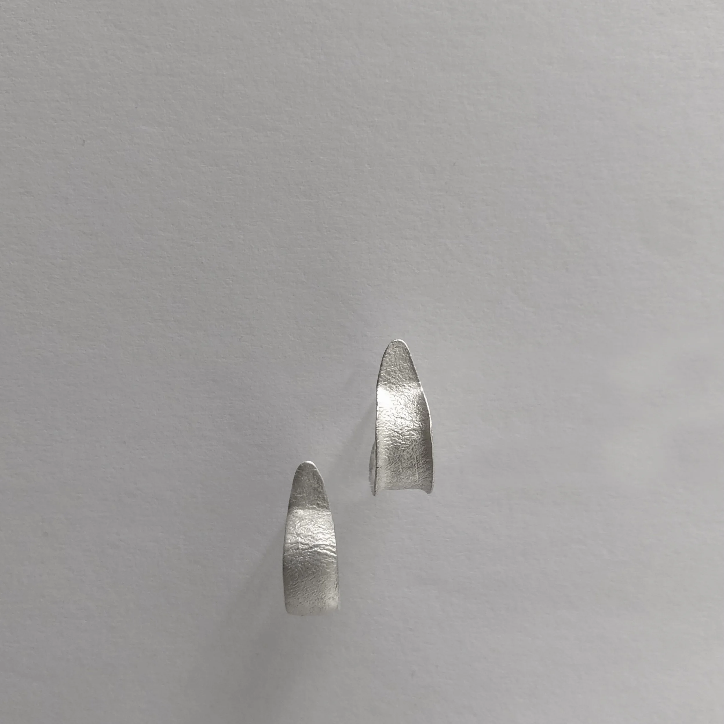 Melted on the surface. Filed and bent into shape. Both earrings weight one Gram. Just by bending a curve inwards or outwards, the earring appears lighter or heavier.